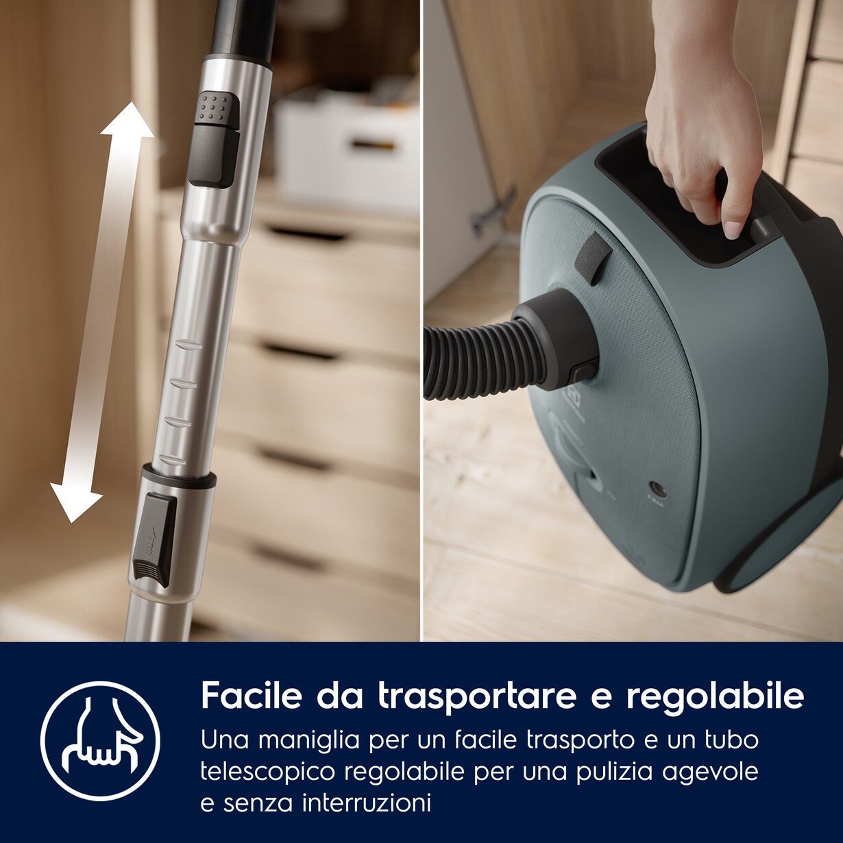 Les roues faciles à rouler vous permettent de manœuvrer l’aspirateur sur différentes surfaces sans aucun effort. La portée de 12 mètres vous permet de vous déplacer librement d’une pièce à l’autre.