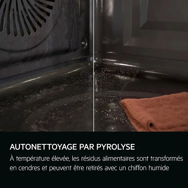 Le nettoyage pyrolyse à haute température transforme les graisses et les résidus alimentaires en cendres. A la fin du cycle, vous n’avez qu’à essuyer l’intérieur du four avec un chiffon humide.