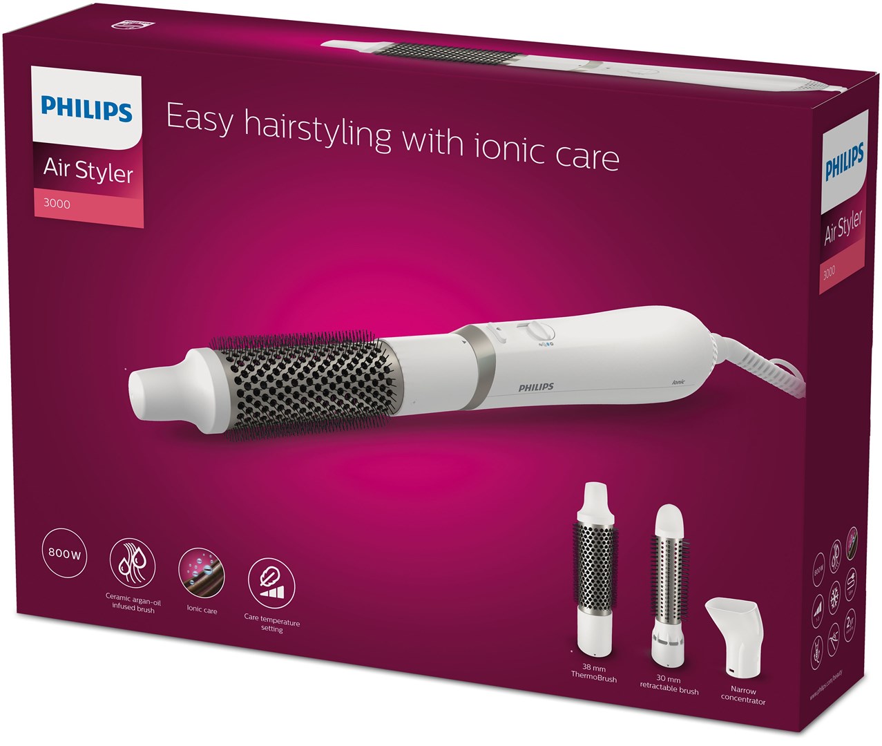Séchez et coiffez simultanément : le Philips Air Styler 3000 vous permet de créer de magnifiques coiffures naturelles tout en apportant une brillance supplémentaire grâce à l’effet ionique. Les 3 accessoires inclus conviennent aux cheveux longs et courts, pour un coiffage facile.