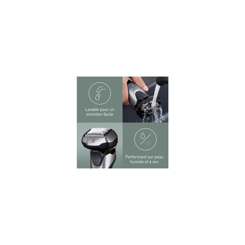 Toutes les barbes de trois jours sont éliminées grâce à nos 5 lames courbées de conception spéciale : celle de taille rapide est conçue pour pré-couper les longs poils, la grille de levage rapide relève les poils aplatis, et la lame de finition assure une deuxième coupe au plus près de la peau.
